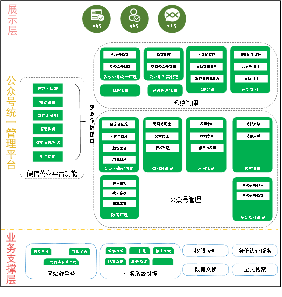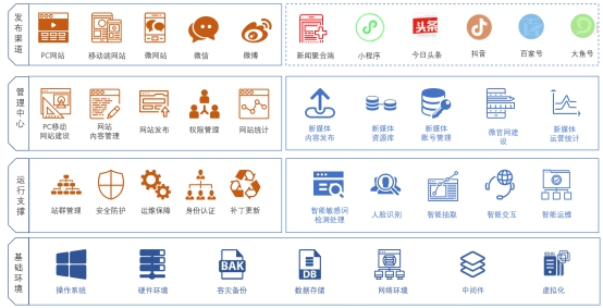 产品定位于全面聚合主流媒体平台,整合PC网站、手机网站、微网站、微信、微博等现有媒体渠道,理顺相互关系、统一技术规范,实现各级单位基于一个平台的统一建设,解决各媒体端信息发布多次重复录入的问题,推动新媒体互联互通、整体发声、协同联动,同时通过新技术实现全媒体智能管理、智能交互、智能运维,有效实现全媒体内容资源的统一聚合、全面管理、统一调度。