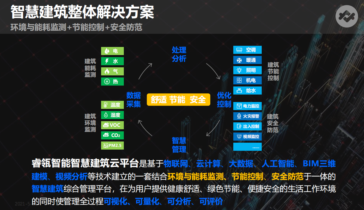智慧建筑综合管理平台是基于物联网、云计算、大数据、人工智能、BIM三维建模、视 频分析等技术建立的一套结合环境、能耗监测、节能控制、安全防范于一体的智慧建筑综合应用与管理平台,在为用户提供健康舒适、绿色节能、便捷安全的生活工作环境的同时使管理全过程可视化,可量化,可分析,可评价。