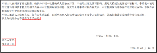 ★ 要求申请人手写抄写承诺段落,确认软件为独立开发,未使用AI开发编写代码、撰写文档或生成登记申请材料且提交材料内容真实