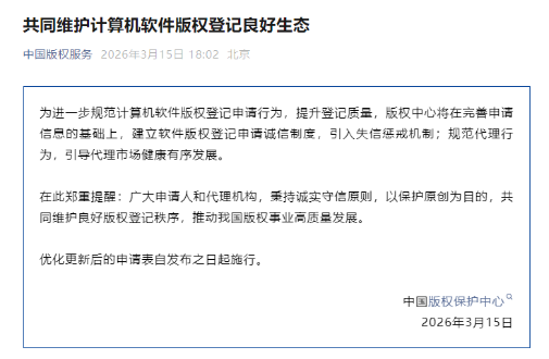 国家版权局中国版权保护中心2026年3月15日正式发布重磅公告,明确提出建立软件版权登记申请诚信制度、引入失信惩戒机制,全面规范软著登记申请行为,标志着软著登记从严整治非正常申请的改革正式落地,对所有申请人与代理机构提出全新且严苛的要求!