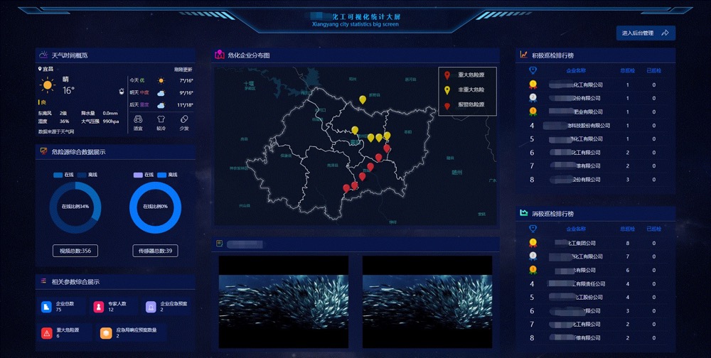 实现了对园区内部通过重大危险源企业内部的风险单元按风险等级进行分级统计,并且对园区内部企业的风险管控措施清单进行统计,以及展示园区内部企业的风险四色图情况,对园区内部企业的隐患上报情况进行统计和分析,并且对园区内部所有企业的隐患排查任务执行情况按日期进行搜索以及对园区企业隐患治理分析情况的展示