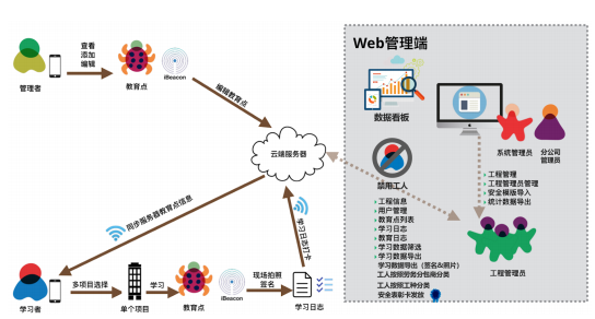 6.借助蓝牙iBeacon、云计算、物联网、大数据等技术,将培训工作从聚集性培训转变为自主的无接触式学习,将培训场地搬到作业现场,并在作业人员、现场管理人员、企业管理人员间建立高效的协作关系,提供全新的培训管理模式。