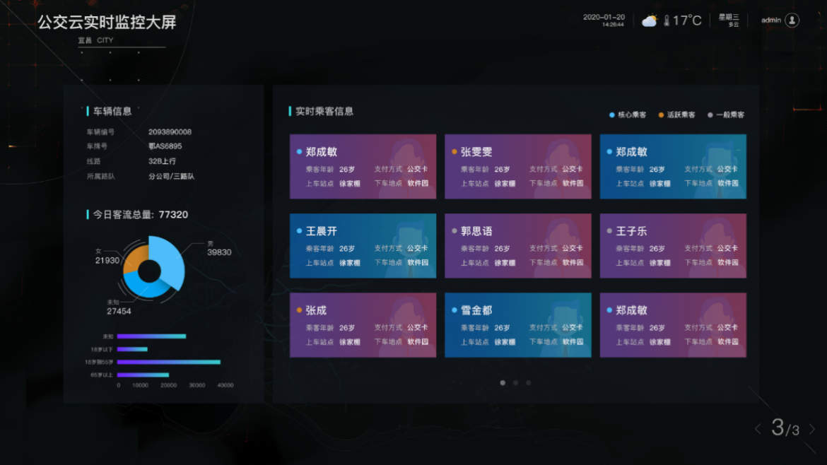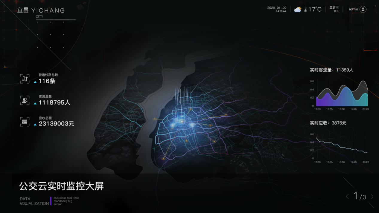 线路监控页面展示了5个指标数据,其中3个是累加数据:营运线路总数、客流总数以及营收总额。还有两个指标为实时数据:实时客流量和实时营收。