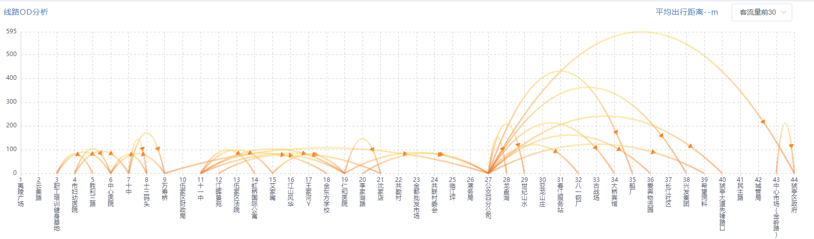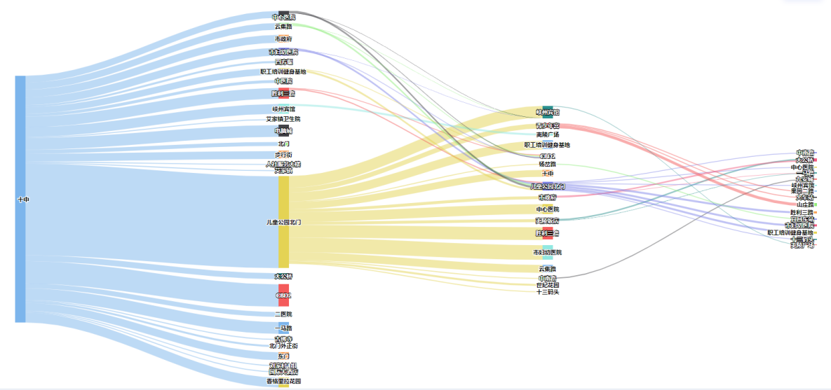 站点OD采用桑吉图的模式,用户可根据图表查看出从十中出发的乘客都是乘坐什么车,去了哪里,并通过计算得知站点的每日总客流是多少。