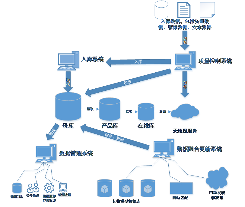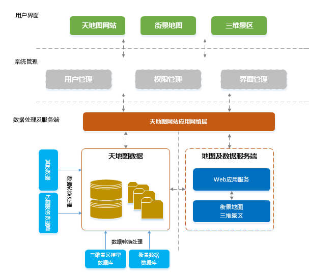 该系统总体架构包括天地图母库、产品库、在线库以及相对应的数据库管理系统。