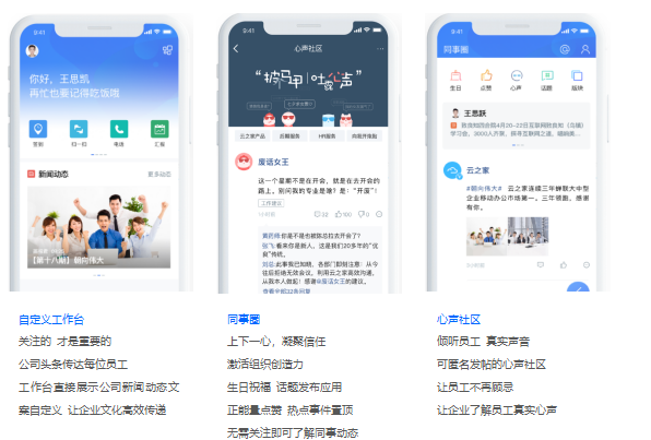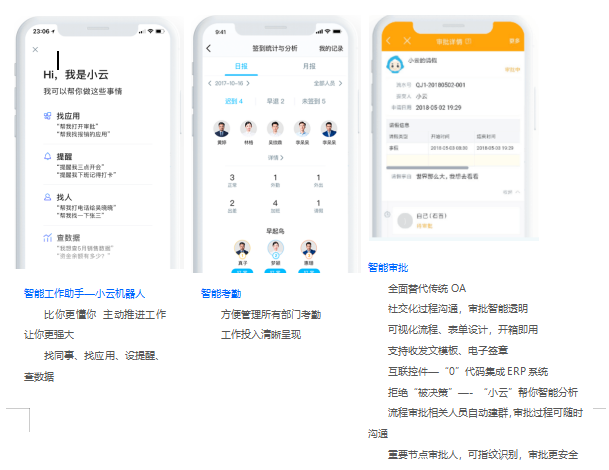 全程实现移动办公,开放API实现ERP业务快速连接。消息自动识别转日程安排,语音找同事、找应用。社交化过程沟通,互动讨论更高效。