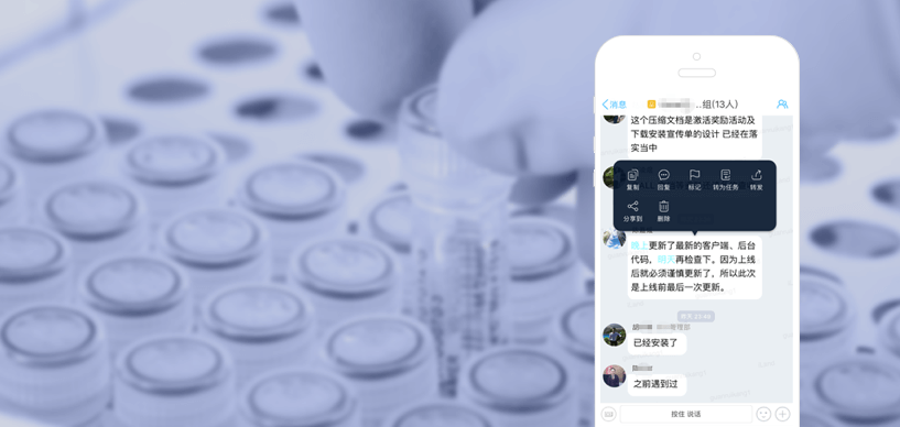 任务指派、指定回复、标记提醒、阅读回执、安全水印、文档留存。ibgi的即时通讯与微信、qq不同,它是基于工作场景下的,除了背景的安全水印。我们可以对消息进行指定回复,可以进行后续标记提醒、看到别人是否阅读了此消息,还能一键转为任务,解决了在工作沟通中被刷屏、消息的必达性、重要事项被遗忘等症结。同时我们的群组文件,解决了消息组中的知识沉淀问题。