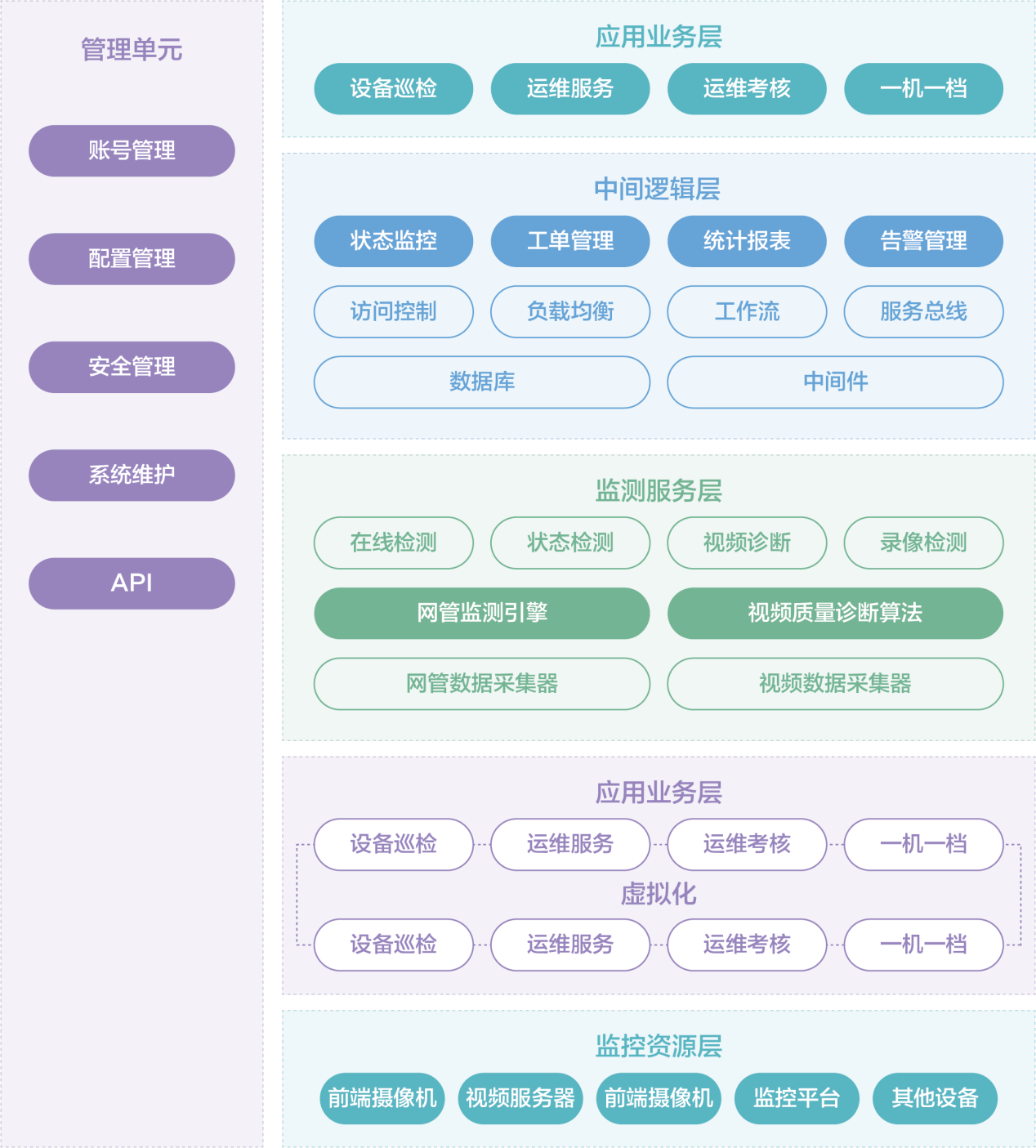 逻辑层为用户提供了统一的运维管理服务,集中汇聚监测视频网中视频设备的主要故障告警信息,实现运维监控、告警监控、工单处理的统一管理,并形成运维相关数据报表。