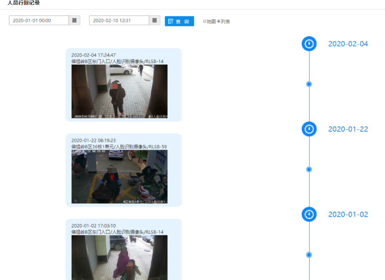 基于小区出入口、单元门及主要路口布设的人脸识别探头,对确诊患者、疑似病例、密切接触者、春节返乡人员等重点防控对象的异常动态实时告警并推送给网格员、社区工作人员;利用平台查阅防控对象在小区内的行动轨迹,支撑基层防控工作。