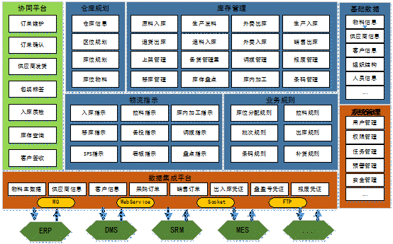 与外部系统的无缝集成:支持与ERP、WCS、MES、DMS多系统的无缝集成,系统提供多种不同方式的集成策略(RESTFUL API、 Web Service、MQ、FTP等)。