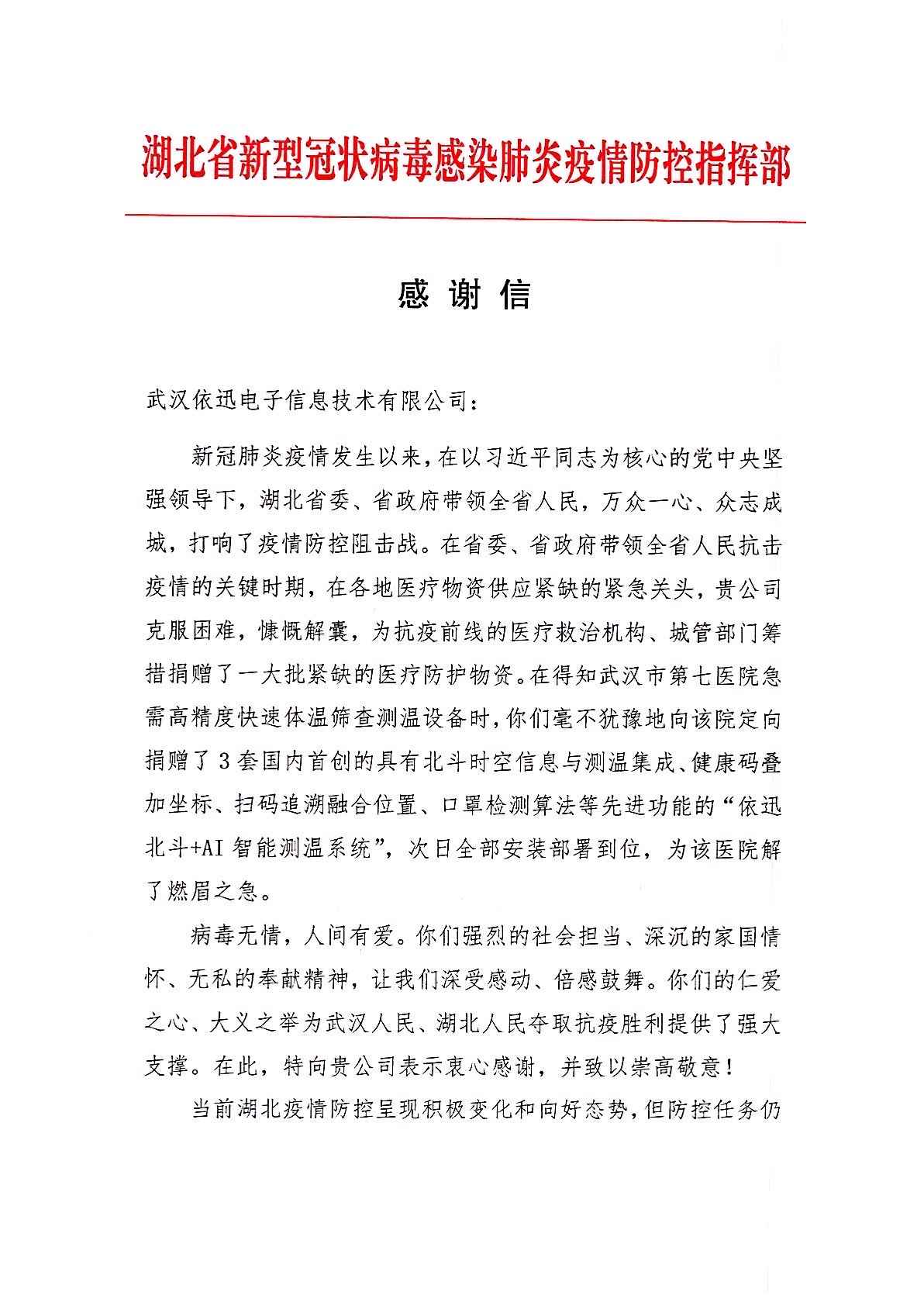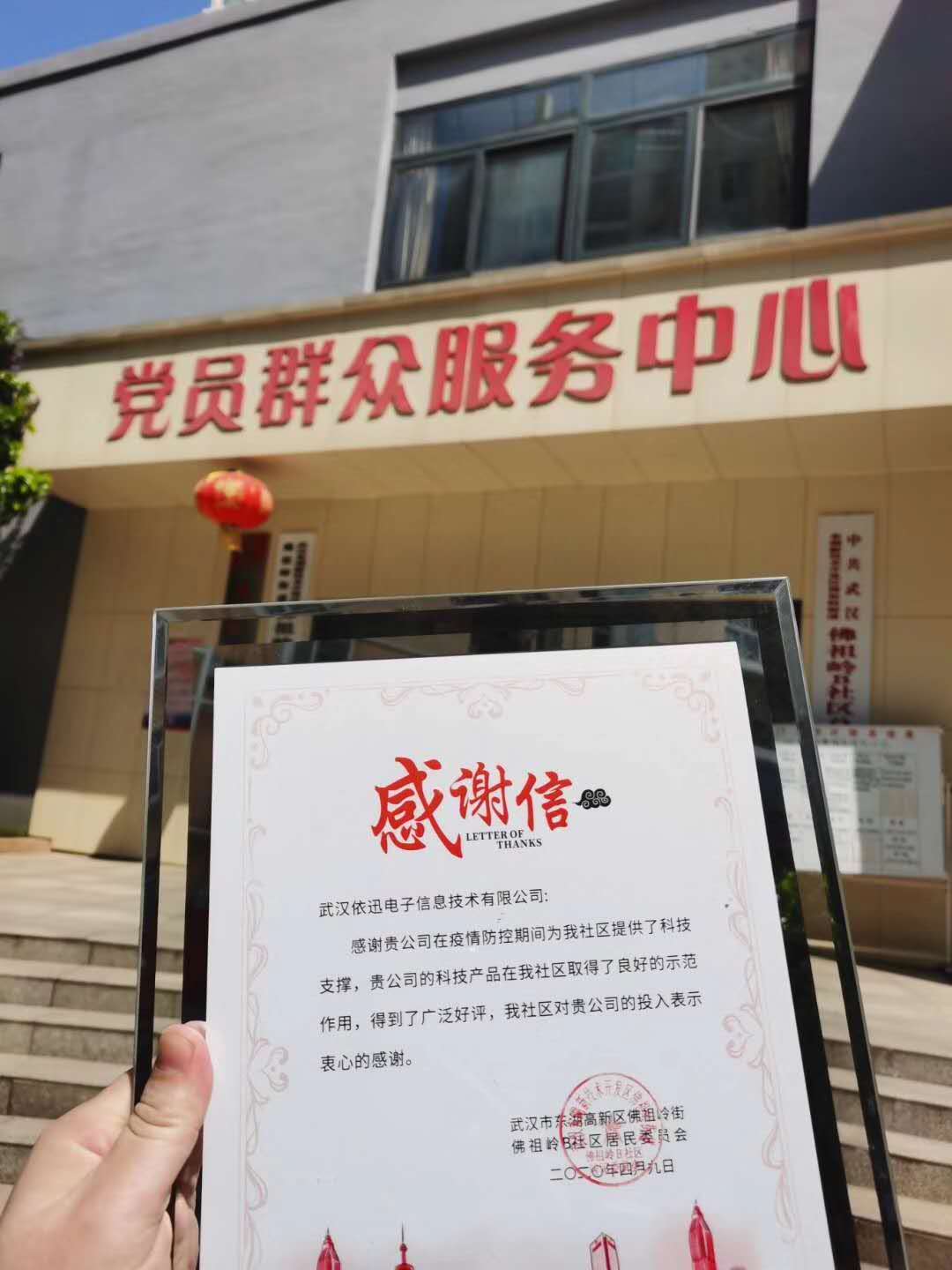 ③应用成效显著。公司自主研发的基于北斗的AI疫情监测防控系统,已为武汉地区社会各界团体及个人提供服务,广泛应用于商超、政企单位、院校、银行、写字楼宇、小区物业,通过自定义配置调整AI身份识别和体温检测的高融合,可实现AI值守、毫秒测温、刷脸开门、绿码对接等功能,用科技创新解放生产力。该系统得到了社会各界的好评,成效显著,湖北省新型冠状病毒感染肺炎疫情防控指挥部、武汉市第七医院、东湖高新区佛祖岭社区等单位纷纷给依迅公司发来的《感谢信》。正如感谢信中所说,病毒无情,人间有爱。你们的仁爱之心、大义之举为武汉人民、湖北人民夺取抗疫胜利提供了强大支撑”。
