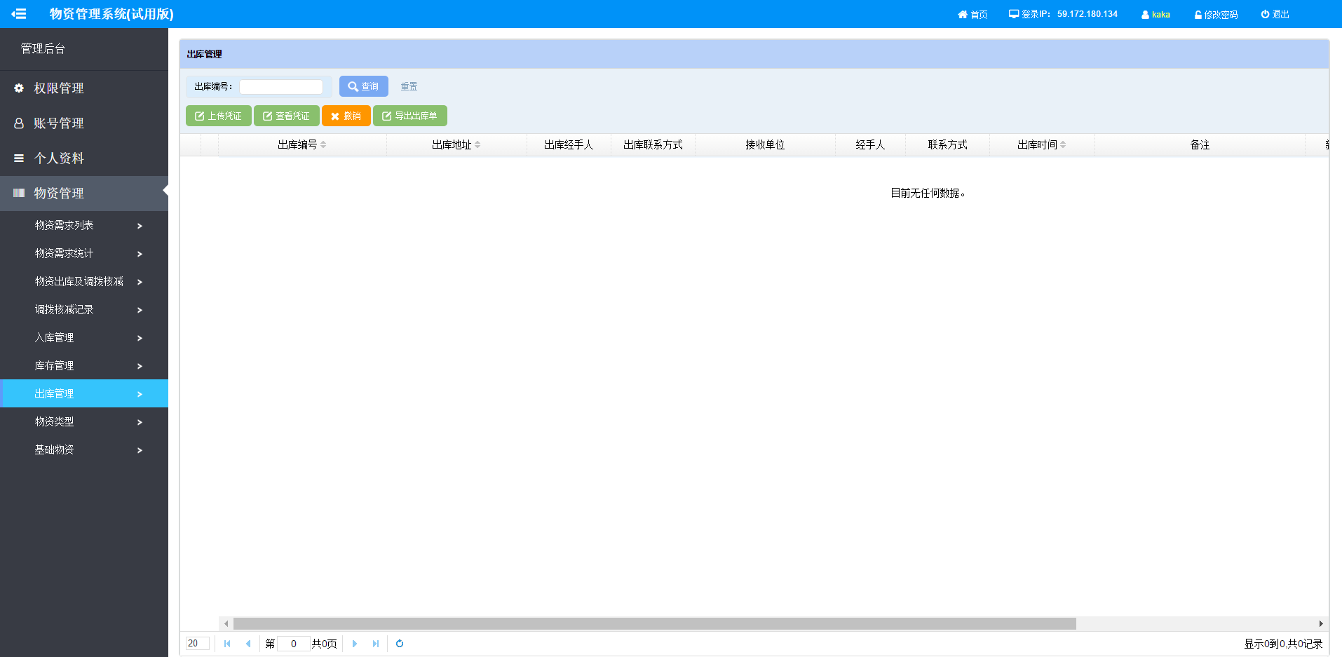 根据使用医院、社区、企事业单位的物资需求内容和物资的库存量系统,通过算法自动匹配物资出库和调配数量,实现一键出库功能并将出库记录记录在系统中。