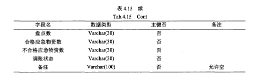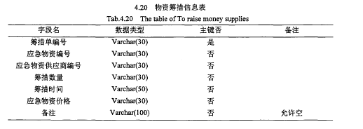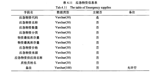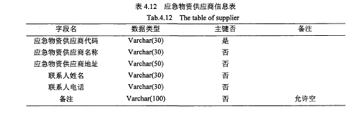 3 | 应急物资供应商信息表 | 应急物资供应商代码、供应商名称、地址、联系人姓名、电话、备注 |