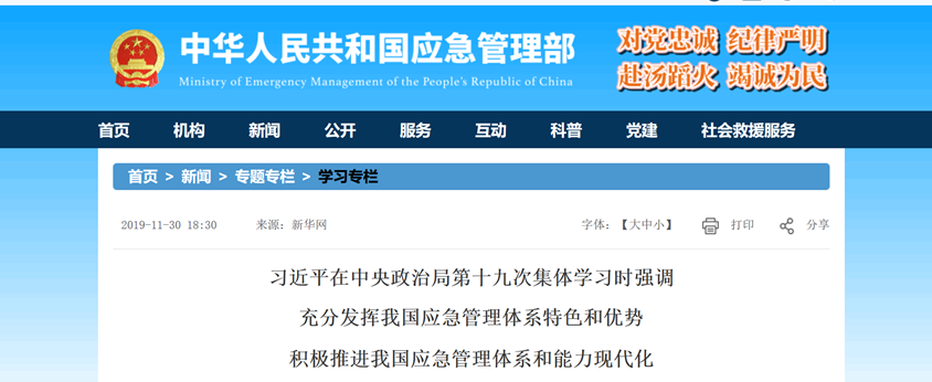 中共中央总书记习近平在主持我国应急管理体系和能力建设进行第十九次集体学习时强调,应急管理是国家治理体系和治理能力的重要组成部分,承担防范化解重大安全风险、及时应对处置各类灾害事故的重要职责,担负保护人民群众生命财产安全和维护社会稳定的重要使命。要发挥我国应急管理体系的特色和优势,借鉴国外应急管理有益做法,积极推进我国应急管理体系和能力现代化。