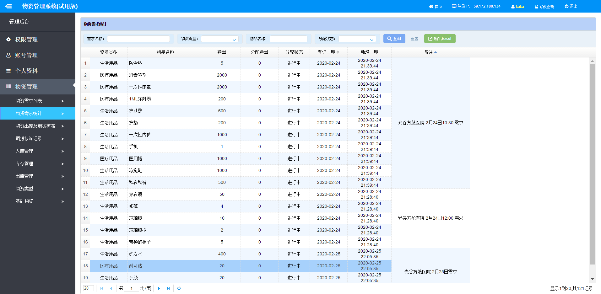 系统可实时根据物资需求和物资库存量实时统计物资需求,对物资的需求量、库存量进行统计,计算出剩余库存和物资的缺口,并将该数据输出为Excel文件。
