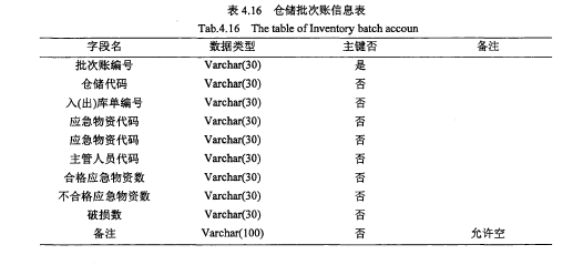 7 | 仓储批次账信息表 | 批次账编号、仓储代码、出(入)库单编号、物资代码、主管人员代码、合格防护物资数、不合格防护物资数、破损数、备注 |