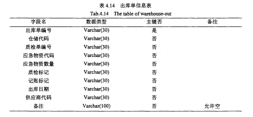 5 | 出库信息表 | 出库单编号、仓储代码、物资编号、数量、记账标记、质检标记、防护物资供应商代码、出库日期、备注 |