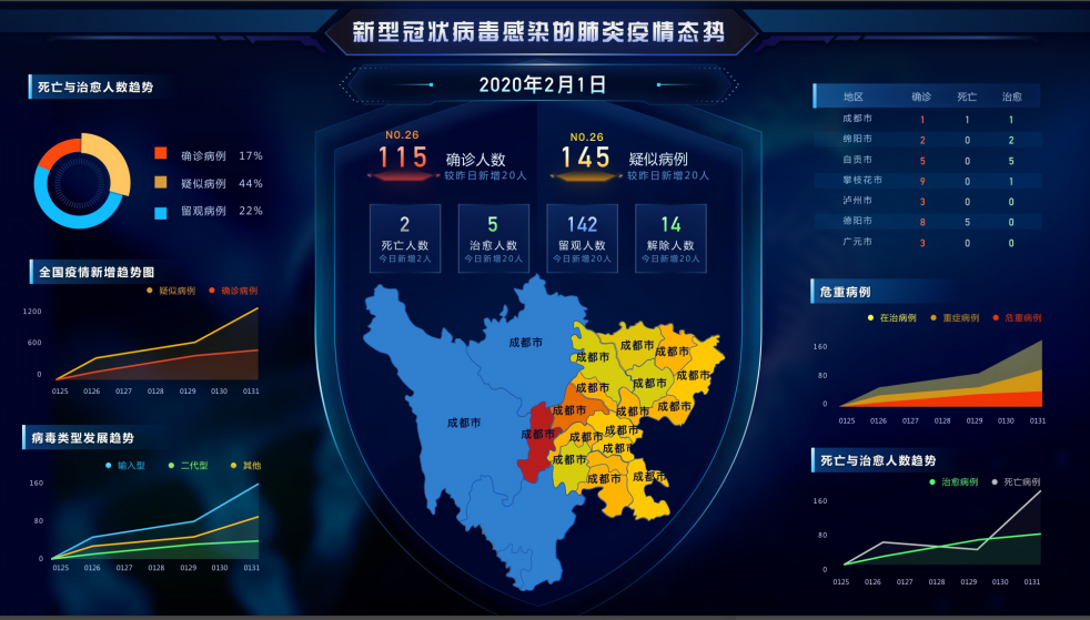 疫情态势实时监测:按照“筛查、治疗、干预”流程,对突发公共卫生疾病的密切接触者、疑似病例和确诊病例进行信息采集,强化疫情数据的动态管理,掌握区域内疫情的时空分布,以减少二代及以上病例的发生。