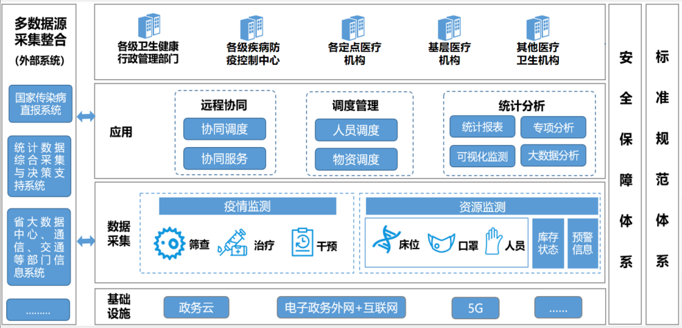 加强对人员、物资的监测与调度功能,降低医护人员交叉感染风险,及时掌握医疗资源储备使用情况,并对各种资源及时进行高效的统筹调配;解决疑似、确诊患者和密切接触者的实时监测及统筹管理问题,以便各级政府及时掌握疫情最新进展;建立统一的远程协同调度管理中控体系,实现医疗机构之间的远程会诊管控;融合卫生、通信、交通等多领域数据,多维度分析、预测疫情,为及时调整防控策略提供科学支撑。