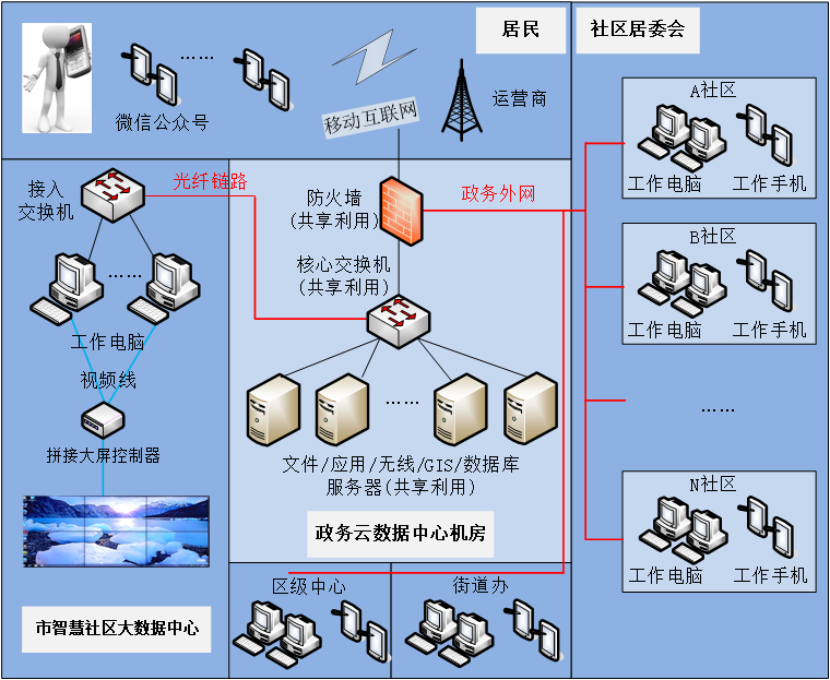 另外,为满足智慧社区的数据传输、网络服务的需求,为提高智慧社区各服务对象之间的通信效率,增强其有效沟通能力及协同作业的效率,建立智慧社区网络拓扑结构。结构由社区信息中心、数据中心机房系统、市级大数据中心、区级中心、社区办公区、社区用户等构成。主要硬件设施有拼接大屏显示系统,负责智慧社区信息状况的实时监控管理与数据展示;数据中心机房共享使用成熟、高效的服务器及存储系统,由数据库服务器、通信服务器以及应用服务器组成,主要用于整合社区内各项业务过程数据的传输和交换。
