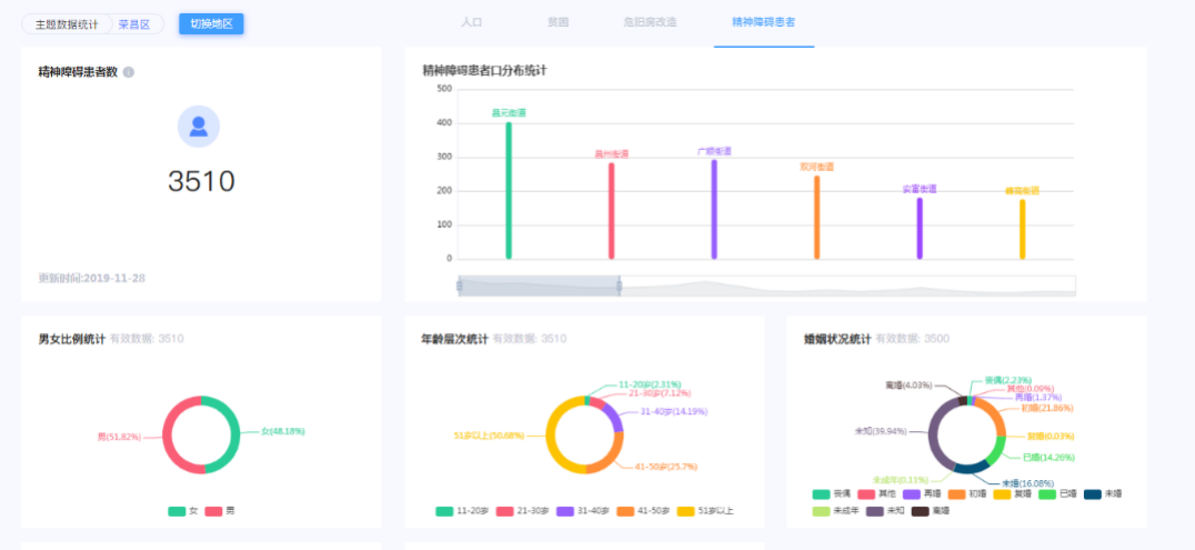 形成了全域人口大数据,数据库中每个人有60多个基础字段,160多个任务字段,通过数据清洗和分析,能在数据中心通过柱状图、饼状图、卡特图、折线图等方式展示出来,初步实现政府辅助决策。