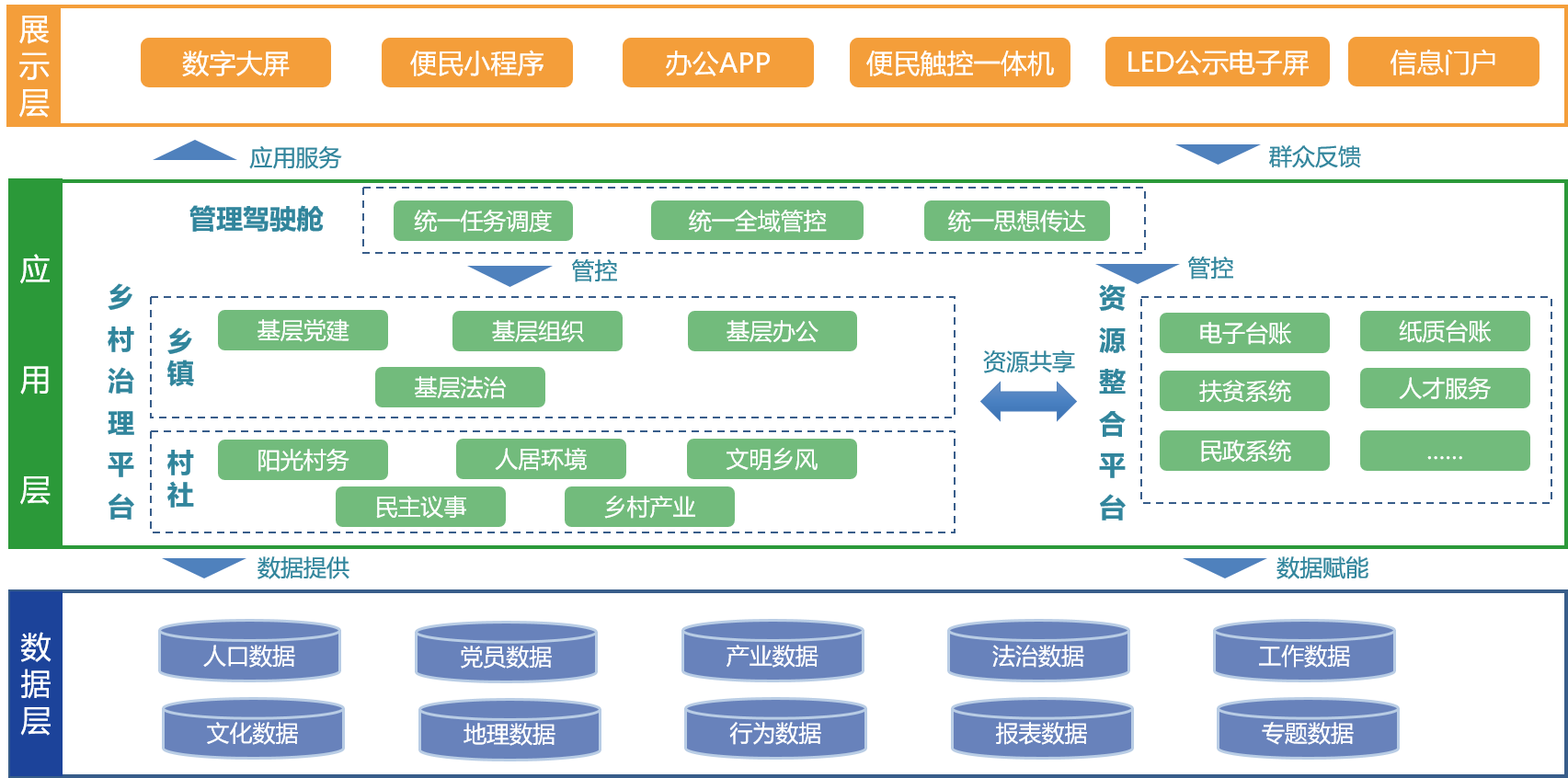 数字乡村-基层治理服务平台让互联网与基层政务实现深度融合,有效优化基层政府业务流程;通过基层大数据池、统一基层政务工作平台、基层政务应用中心等三大核心模块,主要实现以下几个方面功能: