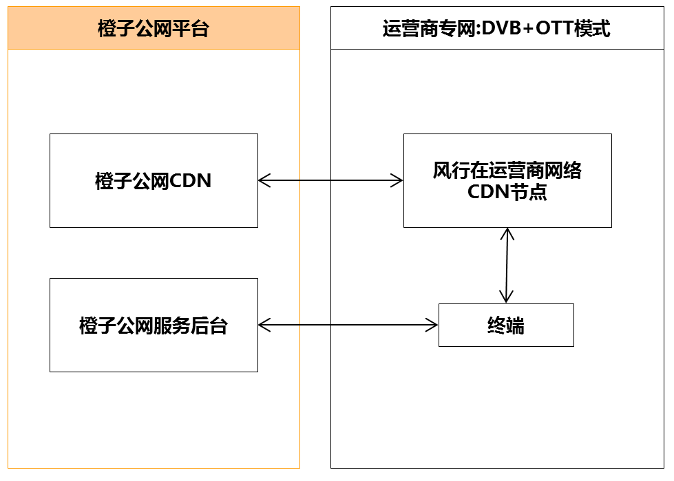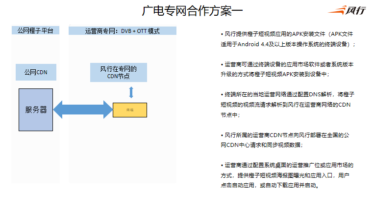 结合运营商的平台环境分析,评估橙子视频合作模式为:独立APK部署,采用CDN直连的方式合作,方案说明如下:
