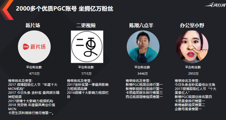PGC专业机构拍摄制作的高质量内容,保证精品、健康、安全。目前已合作的PGC机构超过2000家,覆盖卡思榜上账号超过50%,与爱、优、腾重合度低于40%。目前的在线内容量,已经超过60万条,每天还有3000条左右的更新。四十七个内容分类,覆盖老中青所有人群全渠道的用户收视活跃度高,日人均收看VV超过50次,日人均收看时长95分钟。