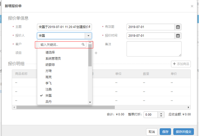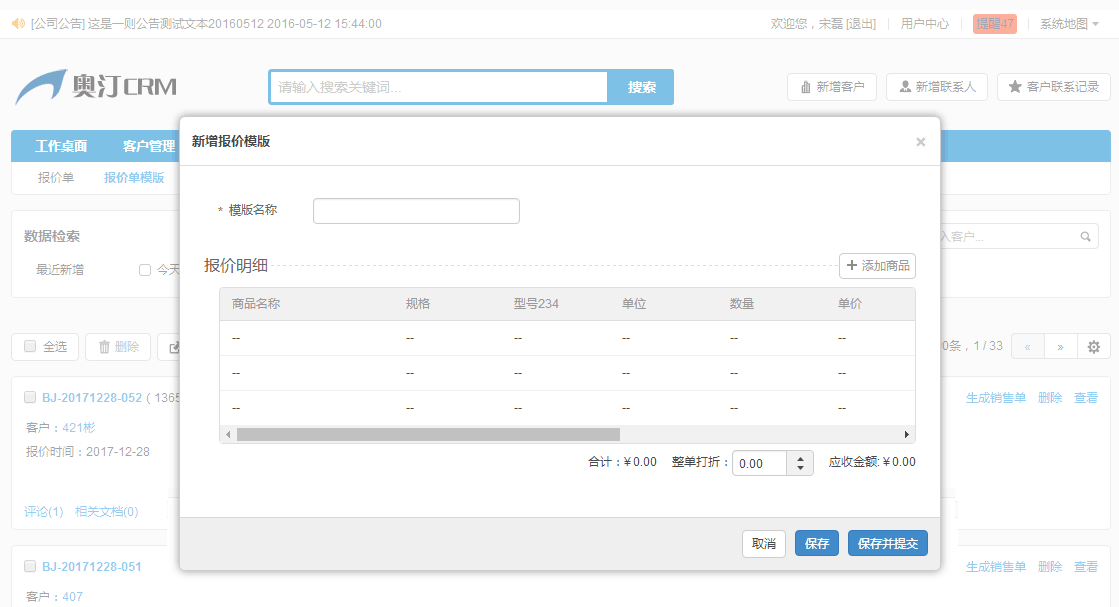 报价单模板,系统在销售管理--报价单中增加报价单模板,可以根据商品信息生成报价单模板,新增报价单的时候可以选择模板或者选择商品,选择的模板可以进行二次编辑新增或者删除商品