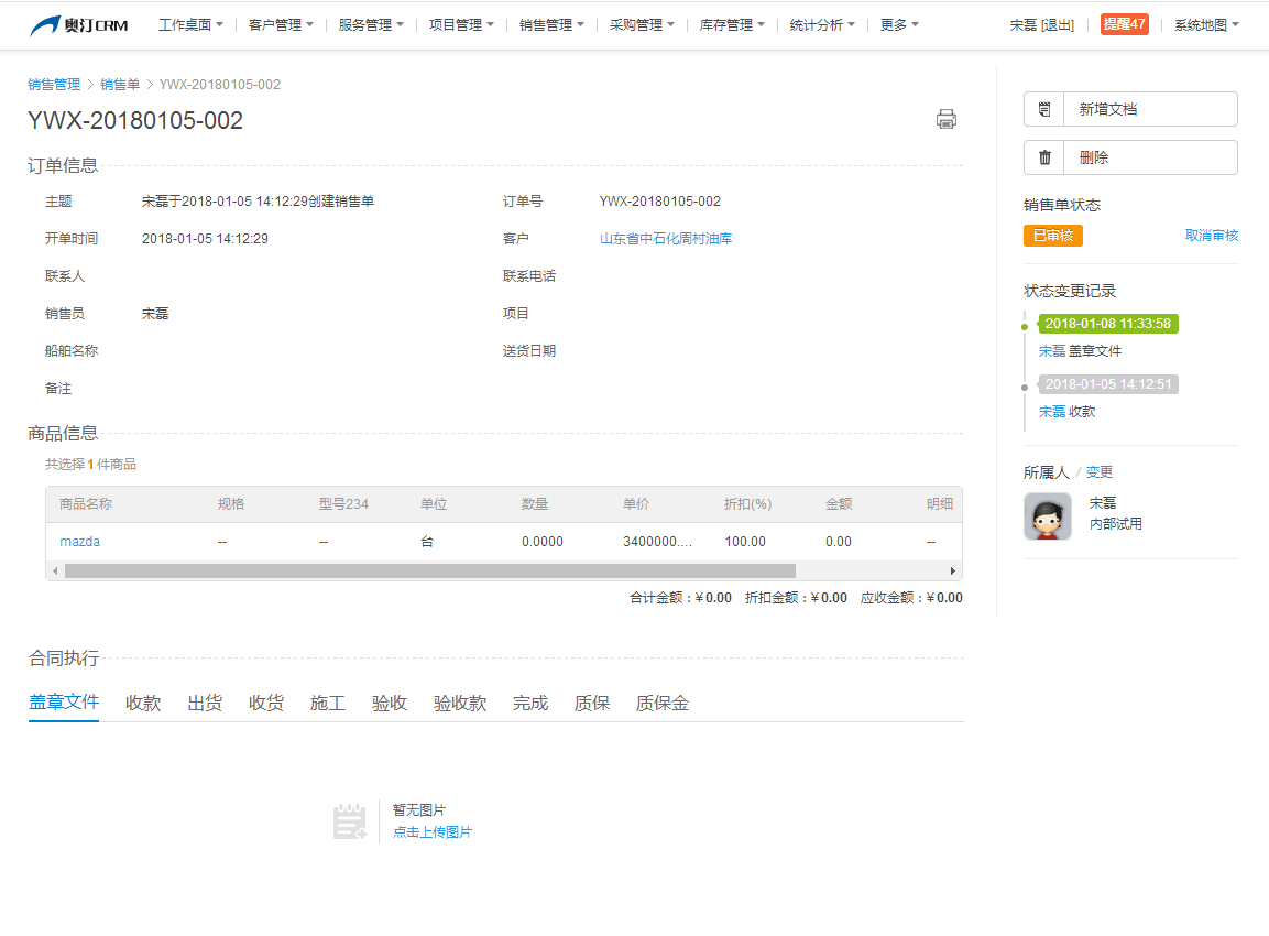 合同执行分为:1盖章文件、2收款、3出货、4收货5施工、6验收、7验收款、8完成、9质保、10质保金,增加操作日志记录