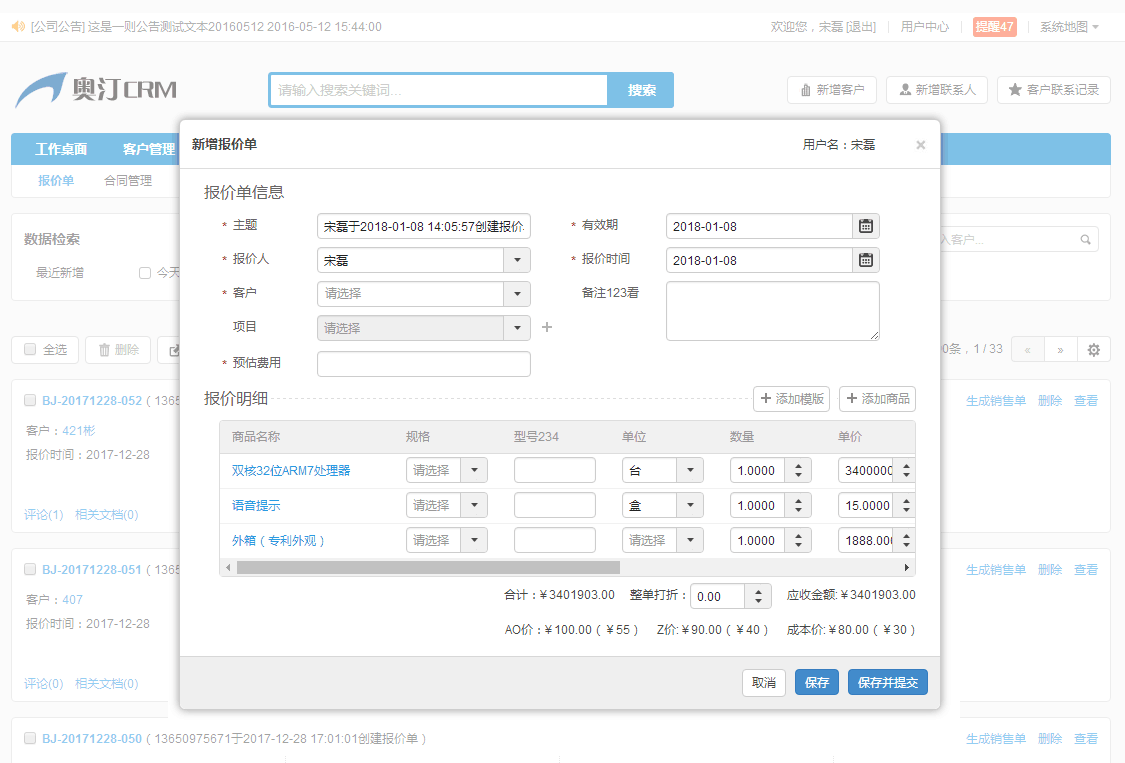 报价单根据权限不同增加Z价、AO价、成本汇总,可以通过报价单查看每个单的大致毛利。