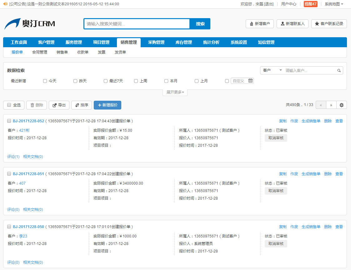 报价单增加“作废”、“复制”功能,“作废”单据任然需要保存,在列表中不显示作废单,客户资料详情下的报价管理里面按照时间先后顺序排列,作废报价单采用红色标记,复制报价单除了单号、报价时间其他内容和复制一样,业务员可以修改任一条件