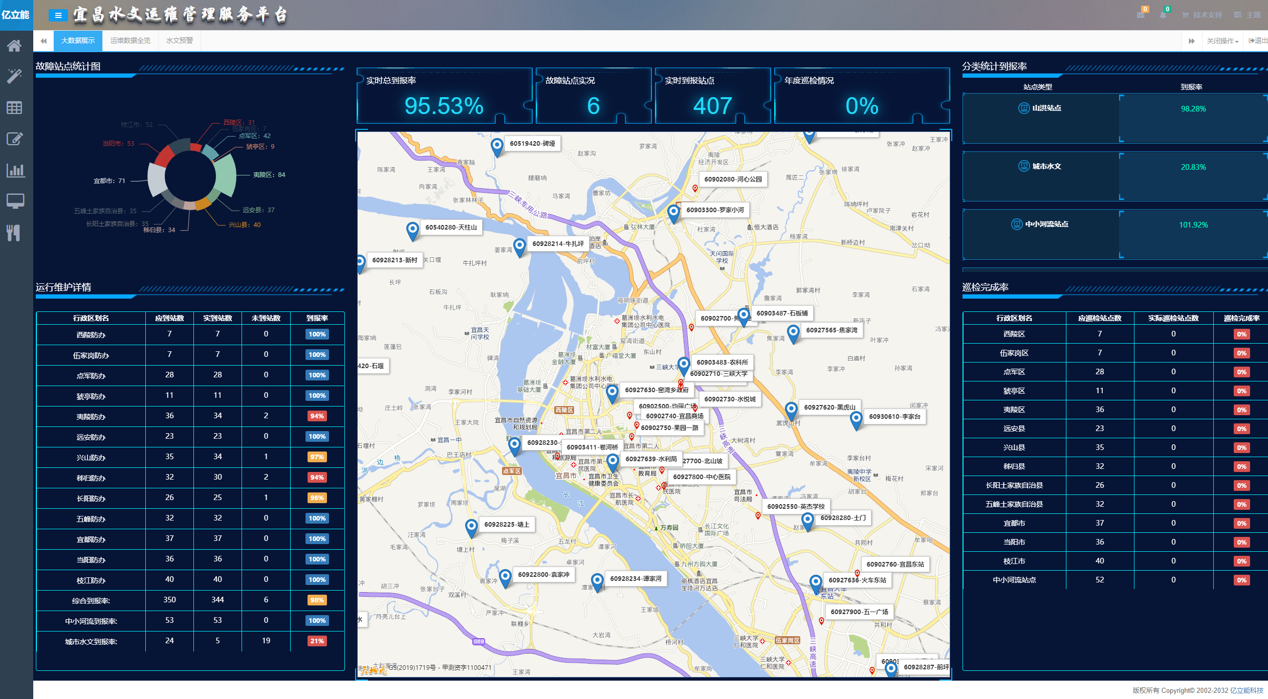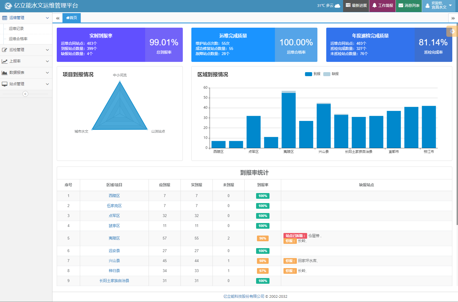 亿立能水文站网运行维护管理服务平台典型应用于《湖北省宜昌市水文水资源勘测局其他专业技术服务(遥测站点运维和软件维护)项目》,项目投资160万,由我公司负责平台开发及运维管理,主要工作内容:所属的408个水位雨量自动测报站点(其中自动水位站86个,自动雨量站322个)、23个城市水文站共431个站点的运行维护及测报系统管理。运用运维管理平台对1个管理中心及下属的分中心的监测系统进行日常监控;配合行政部门信息管理人员进行运维管理。运用平台强大的预警功能,及时开展监测数据缺测,异常等维护及原因分析。运用系统只能汇总监测站点基础信息的准确性,对数据的一致性和原因进行智能分析。平台自运行以来,功能齐全,操作简单,大大降低了平时的工作量,得到了客户的一致认可。为湖北省宜昌市水文水资源勘测局,提供了可靠的数据保障,可行性的分析报告,为城市内涝、防洪减灾和水资源调度提供决策分析,最大限度的保障了人民和财产的安全。