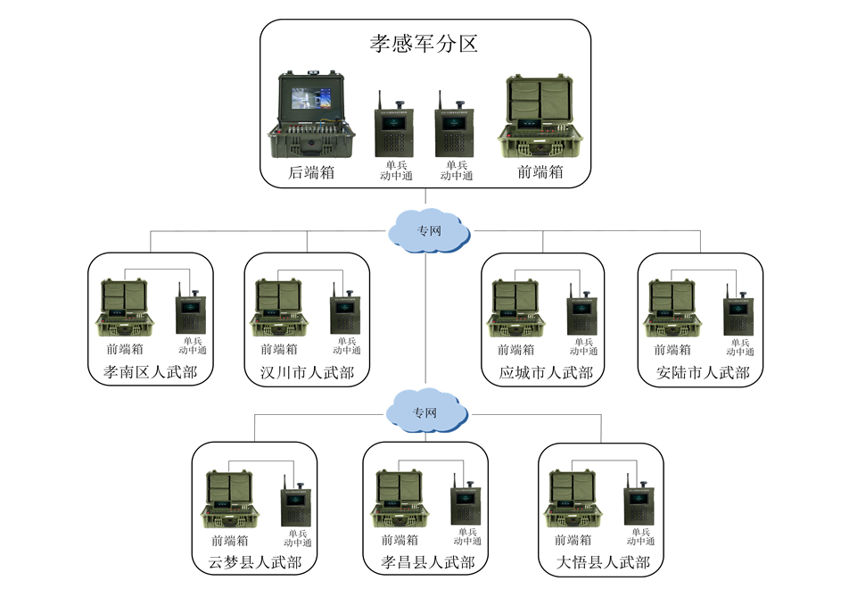 通过后端箱自带的融合通信服务器,可与后端箱、单兵动中通自组网络,实现音视频通信和数据通信功能。