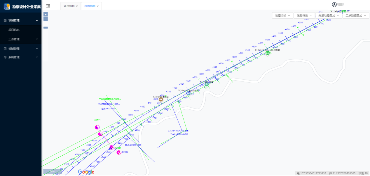 基于移动终端,系统支持在线或离线模式的道路、卫星影像、地形图等GIS地图、设计路线信息,并内置了包括路线、路基、桥梁涵洞、隧道、互通立交、工程经济等各专业的外业采集记录簿模板,提升设计人员的外业采集效率。