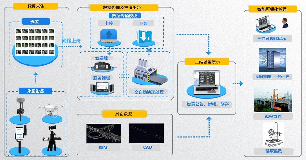 以高清影像为事实基础,通过倾斜摄影测量技术、三维数字技术、计算机辅助成像技术等,基于高清影像与实景三维模型对道路、桥梁、隧道进行缺陷、病害等检测,实现多维度、全生命周期实时监测管理。
