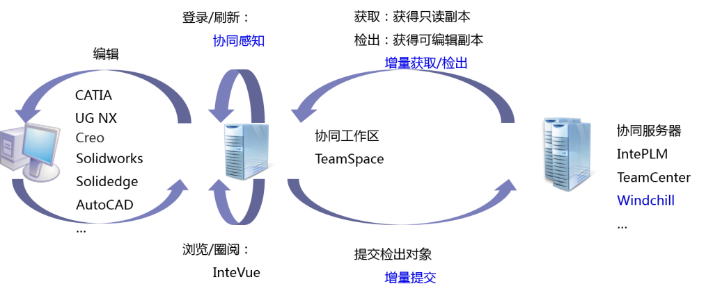 TeamSpace是天喻软件自主研发的、支持所有主流三维CAD三维协同的工作组及管理系统。针对三维设计的协作需求,以数据对象(包括项目/任务、产品、部件、零件或文件夹)为协作载体,能够协同地感知数据对象的动态变化,并自动地增量处理变动部分。TeamSpace支持多CAD环境下、多文件类型、多团队协同,并通过标准接口与天喻IntePLM、Windchill、TC等主流PDM/PLM平台集成。