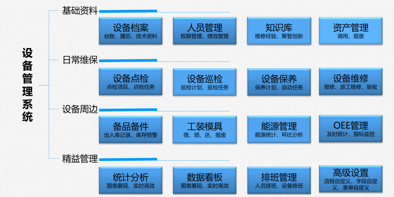 镭立设备管理系统是公司自主研发,以生产设备为基础单元,将与设备相关的人、事、物进行系统化管理,帮助企业提升设备综合效率,达到降本增效目标的管理系统。产品以模块化管理各项具体工作,功能模块包括设备信息化档案模块、人员信息、设备资产管理、资料中心、设备点巡检(润滑)管理模块、维修保养管理模块、能源管理模块、工装模具管理模块、备品备件管理模块、安全管理、经验知识库、OEE管理、数据统计分析报表模块等,同时支持可与其它企业内部现有信息管理系统(如OA、ERP等)连接以达到数据共用的功能。