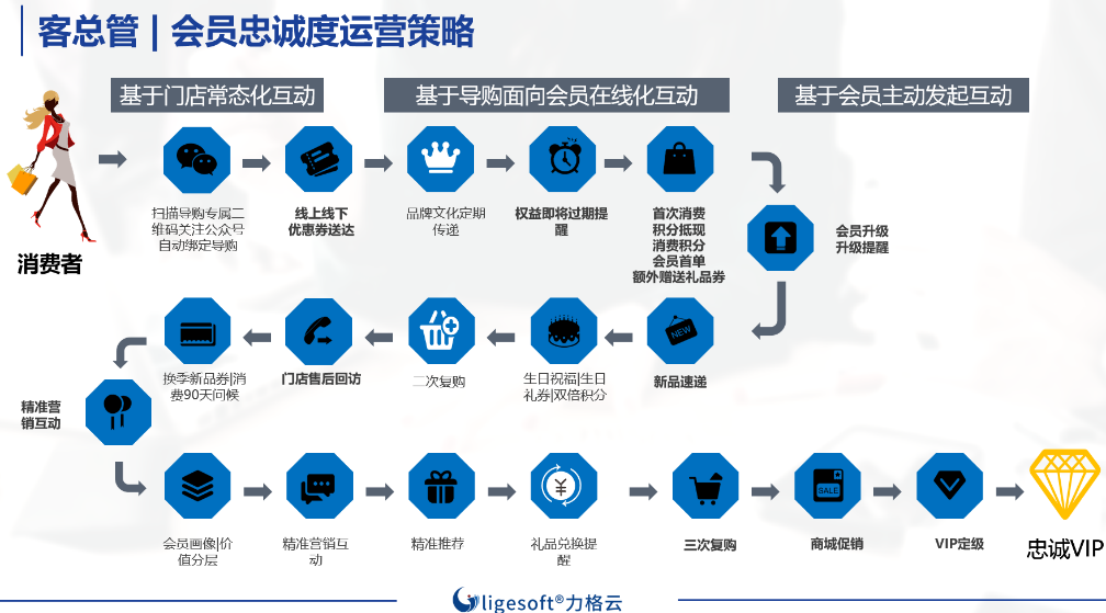 3、新部署客总管会员系统,该系统和上述新零售系统和云POS均无缝联通,该系统包含导购APP、顾客微信端应用和PC端管理后台。