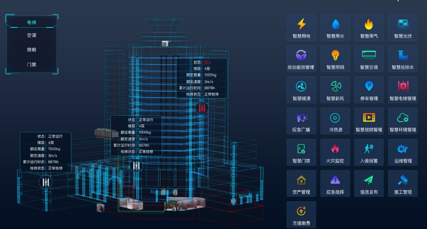 智能3D控制系统以智慧楼控为背景,在3D场景中对冷源、热源、新风、配电室等楼控设备远程实时监测与控制,针对空调、电梯以及其他重点用能设备进行重点管控,主要监测设备的运行状况、用能状况、保养维修状况。并实现远程线上控制。